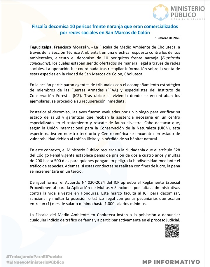 La Fiscalía de Medio Ambiente de Choluteca, a través de la Sección Técnico Ambiental, en una efectiva respuesta contra los delitos ambientales, ejecutó el decomiso de 10 periquitos frente naranja (Eupsittula canicularis), los cuales estaban siendo ofertados de manera ilegal a través de redes sociales. La operación fue coordinada tras recopilar información sobre la venta de estas especies en la ciudad de San Marcos de Colón, Choluteca.
