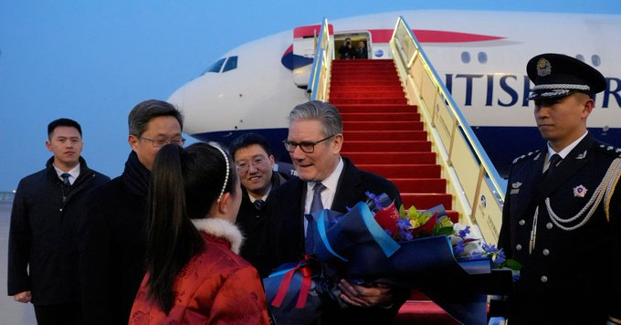 Momento en el que el primer ministro británico Keir Starmer baja de su avión en Pekín