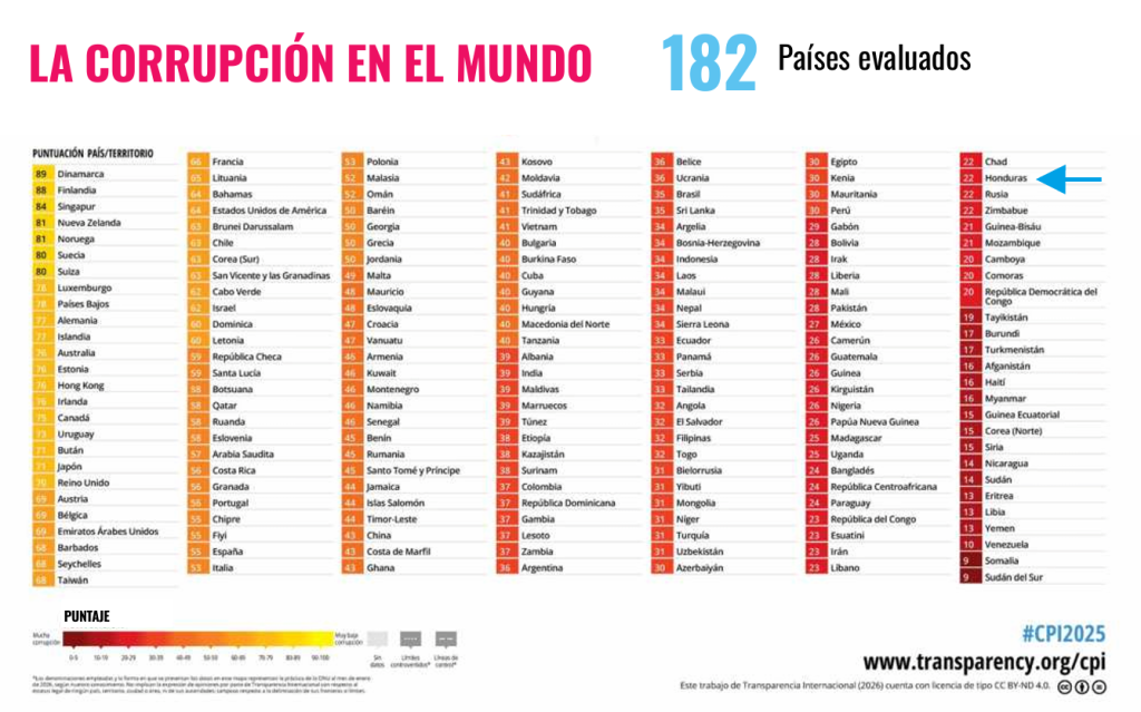 El país obtuvo 22 puntos sobre 100, la misma calificación que en el año anterior, pero descendió tres posiciones en el ranking global, ubicándose ahora en el puesto 157 de 182 naciones evaluadas. Este retroceso relativo se debe a que otras naciones avanzaron en sus indicadores, mientras Honduras no registró mejoras significativas.