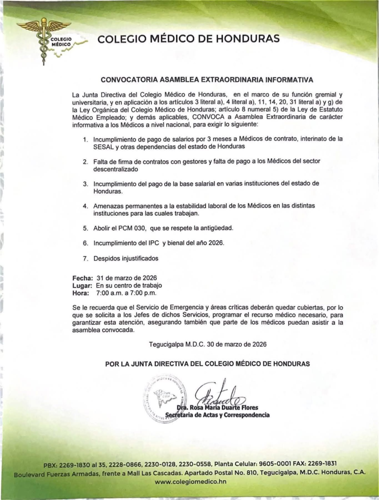 Colegio Médico de Honduras convoca asambleas informativas y advierten endurecimiento de medidas por despidos de médicos